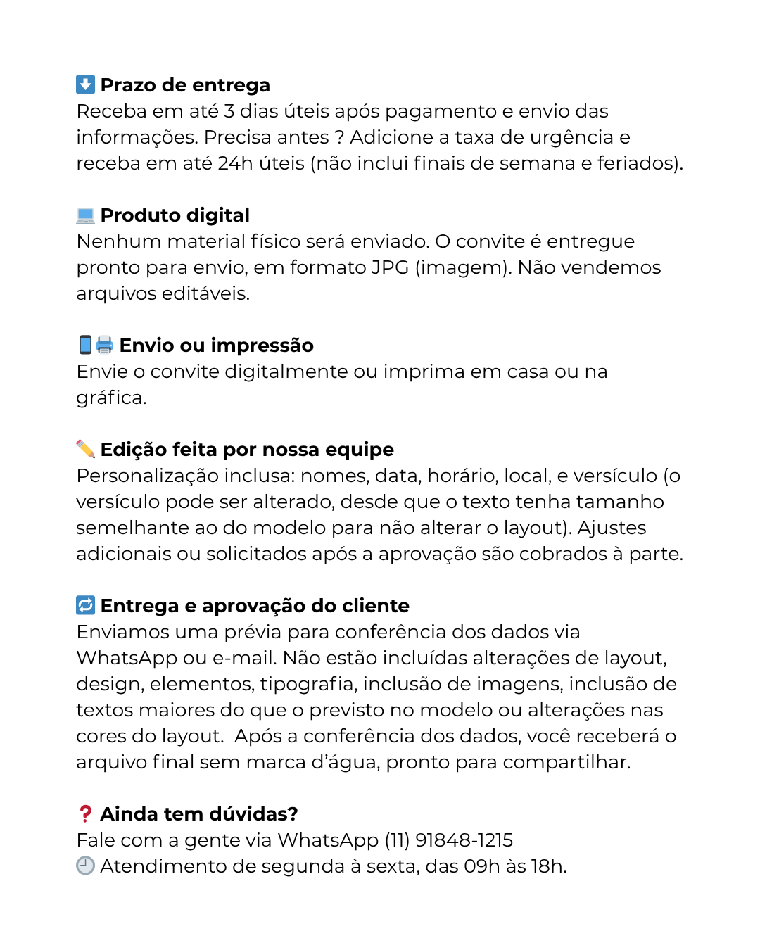 • O versículo do convite pode ser substituído, porém o texto deve ter tamanho semelhante ao utilizado no modelo. Textos maiores podem exigir alteração de layout e poderão ser cobrados à parte.